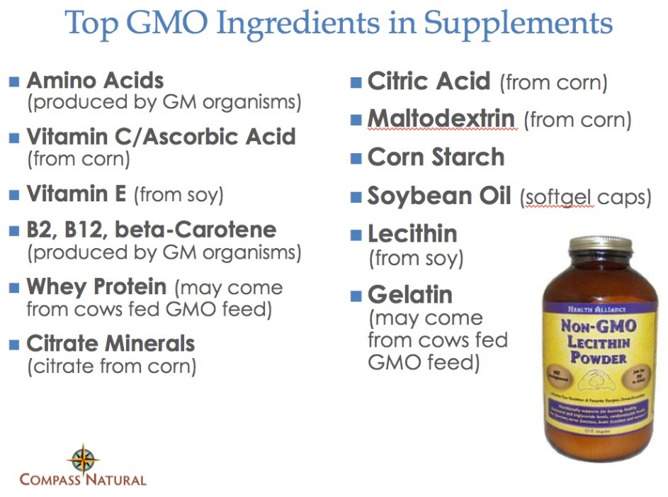 Dietary supplements, too, are subject to GMO ingredients. For example, in many nutritional supplement products, soy lecithin is a common ingredient that may be derived from GMO soy. Same for ingredients derived from corn, 90 percent of which is genetically engineered. Such corn-derived ingredients as maltodextrin, citric acid and cornstarch are often included in nutritional supplements as binders, fillers, excipients, etc. Commercial-grade vitamin C is often processed from GMO corn; vitamin E is similarly derived from GMO soy. Gelatin in gel caps may come from cows given GMO feed over a lifetime. The list goes on, and considering the number of ingredients in any given multivitamin, disclosing for GMOs is a potential migraine headache for supplement manufacturers.